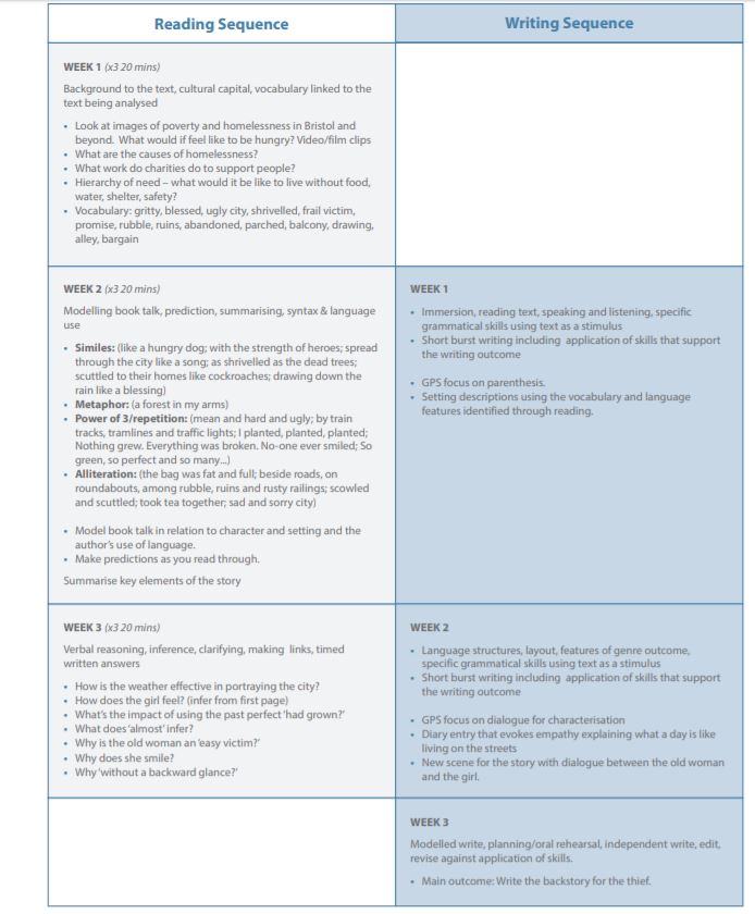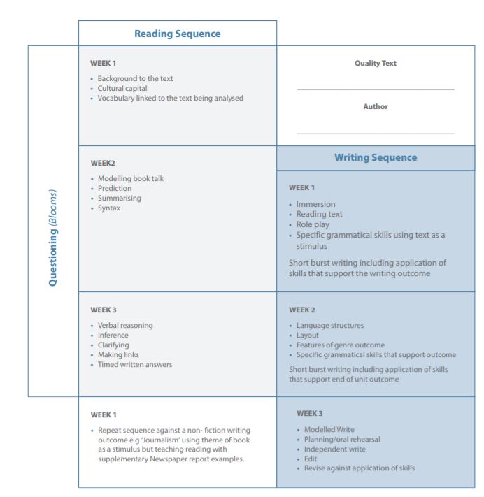 Please note the reading sequence is staggered one week ahead of the writing sequence to ensure key vocabulary and cultural references have been fully explored prior to using the text in writing.